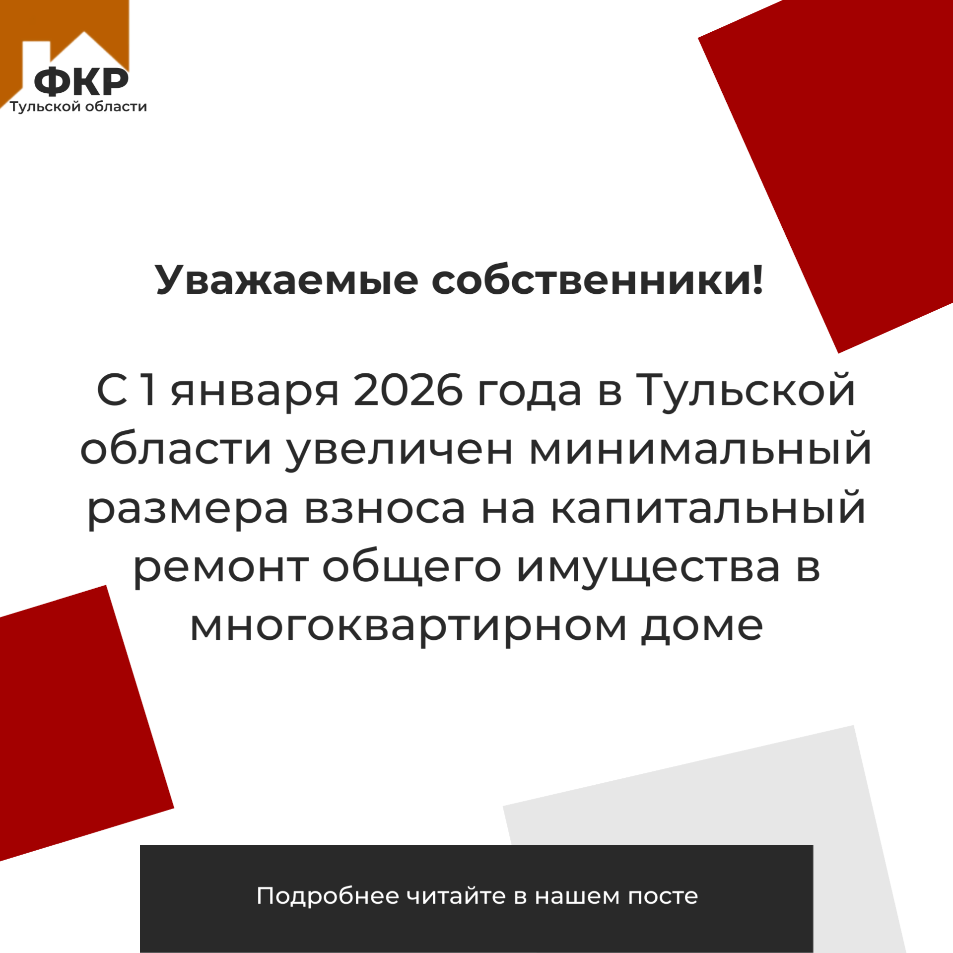 Напоминаем, что с 1 января 2026 года в Тульской области увеличен минимальный размера взноса на капитальный ремонт общего имущества в многоквартирном доме