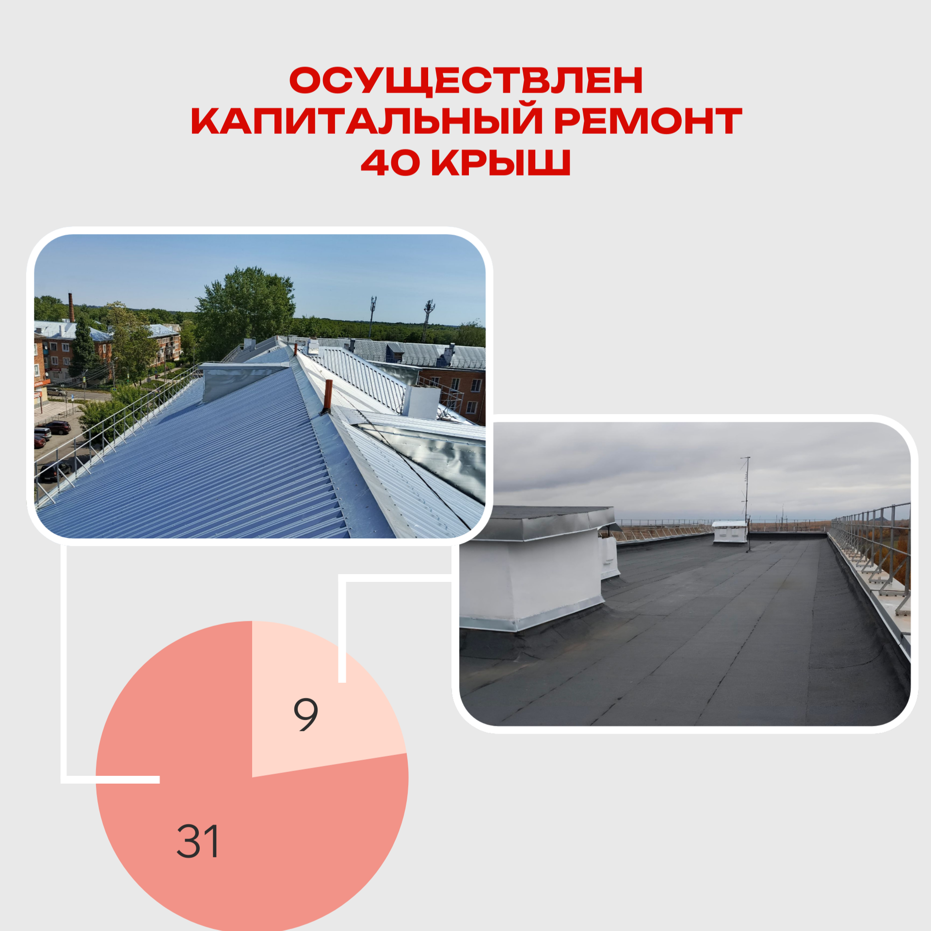 - осуществлен капитальный ремонт 40 крыш, в том числе 31 скатной и 9 плоских;
