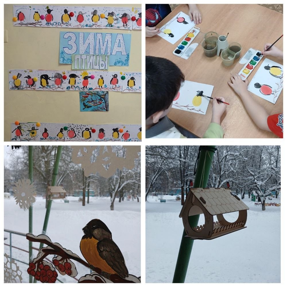 Во всех возрастных группах в рамках этой акции с детьми проводились познавательные занятия, беседы и рассматривание плакатов: «Птицы России», «Птицы разных широт», «Птицы». Также дети рисовали снегирей и синиц, делали аппликацию «Домик для птички».