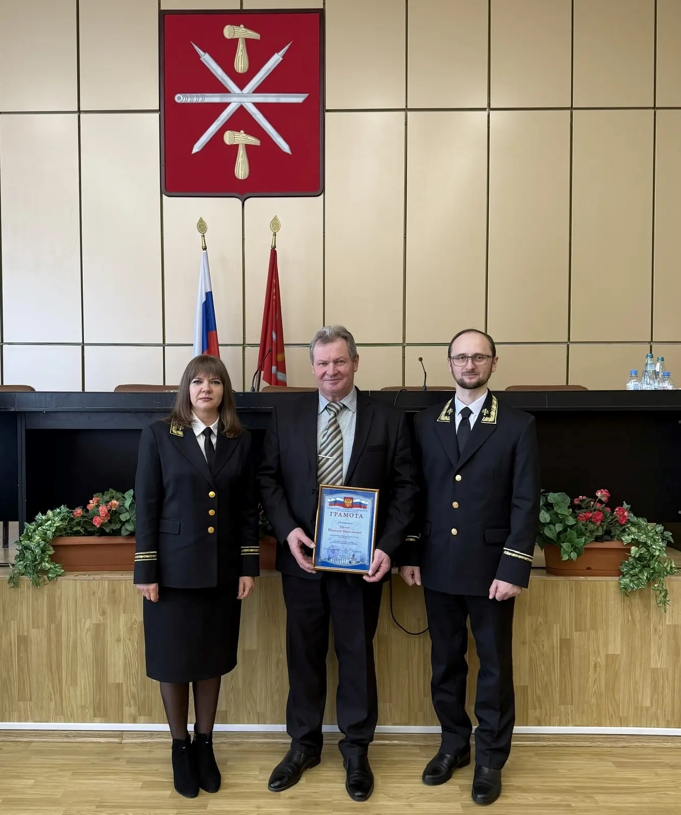 На итоговом совещании судей Тульской области председатель Тульского областного суда И.М Хорошилов и начальник Управления Судебного департамента в Тульской области Е.С. Миронова вручили Н.Н. Орлову грамоту Управления Судебного департамента в Тульской области.