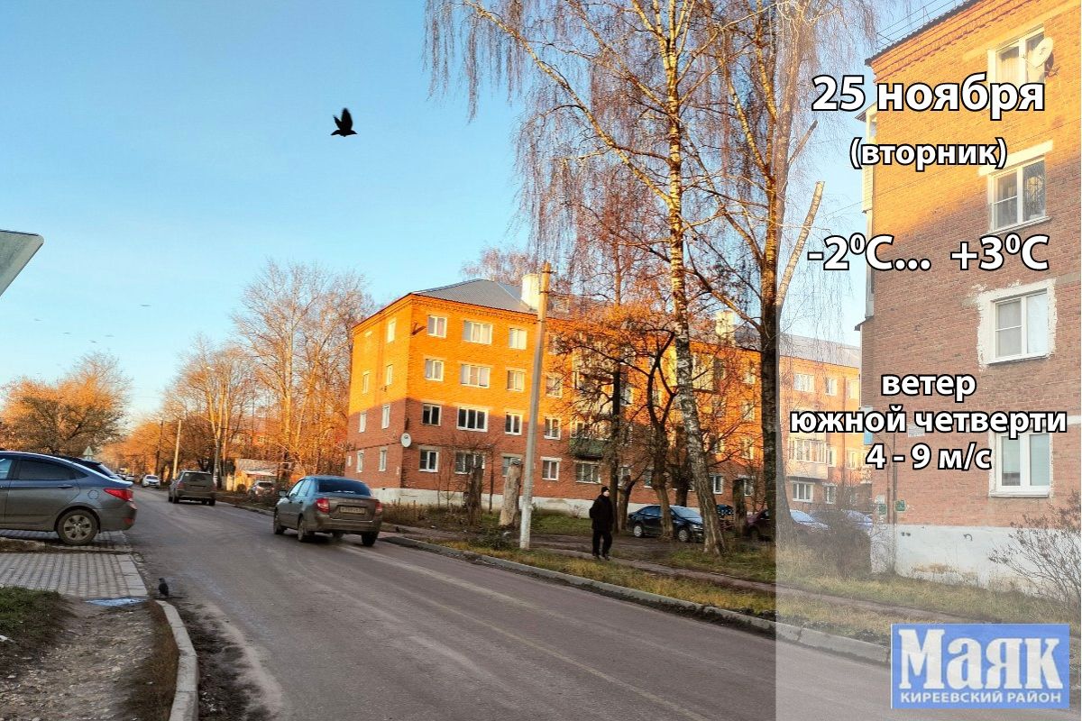 По данным сайта Гидрометцентра России, 25 ноября в Киреевском районе будет облачно с прояснениями. Преимущественно без осадков. Местами гололедица. Ветер южной четверти 4-9 м/с.