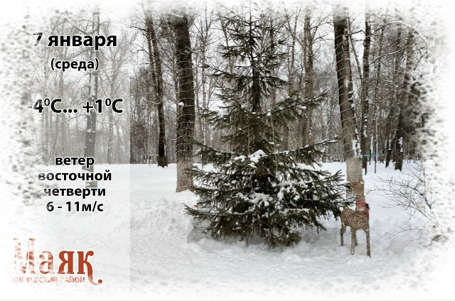 7 января ожидается облачная погода. Днем осадки в виде снега, мокрого снега, местами с дождем (по данным сайта Гидрометцентра России 10,9 мм). На дорогах местами гололедица. Ветер восточной четверти 6 - 11 м/с.