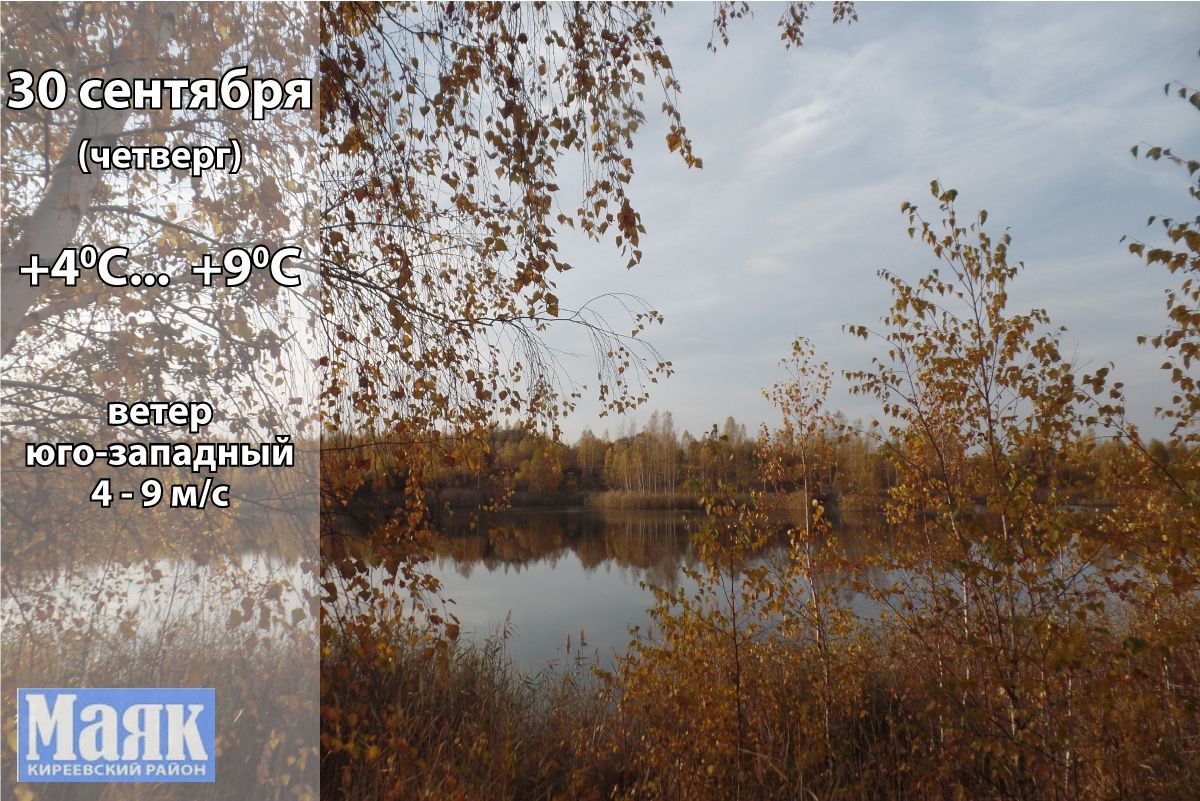 Облачно, местами небольшой дождь (по данным сайта Гидрометцентра России - 0,1 мм) - такая погода ожидается в Киреевском районе 30 октября. Ветер юго-западный 4 - 9 м/с.