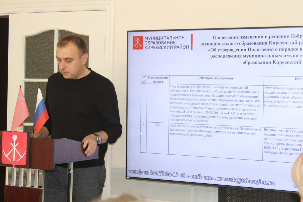 Продолжилось заседание рассмотрением ряда вопросов: «О внесении изменений в решение Собрания представителей МО Киреевский район от 24.02.2011 «Об утверждении Положения о порядке владения, пользования и распоряжения муниципальным имуществом МО Киреевский район». О согласования представления в безвозмездное пользование АО «Почта России» движимого муниципального имущества – бытовка металлическая в д. Сергиевское».