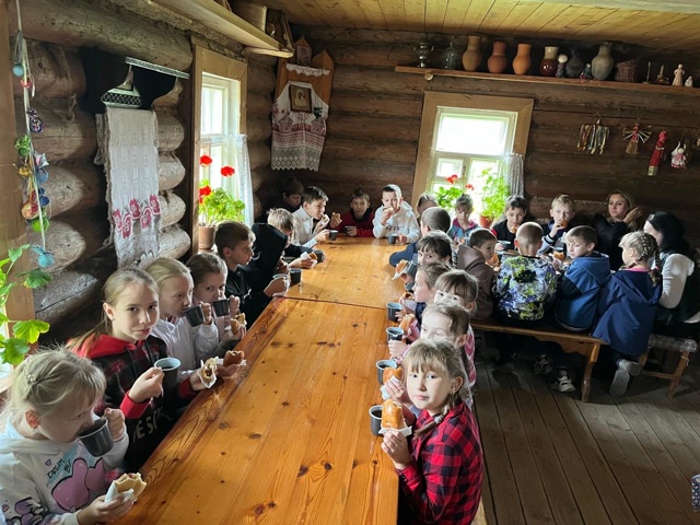 После познавательной экскурсии по избе ребят ждало настоящее русское чаепитие с ароматными пирогами.