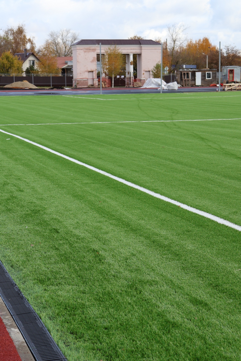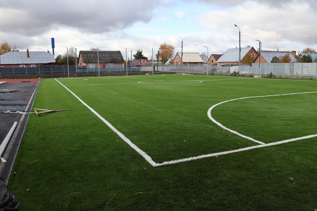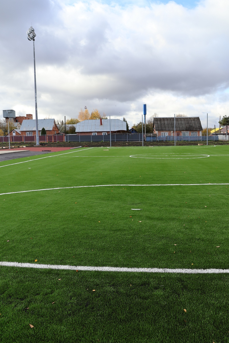 Установлено искусственное покрытие футбольного поля, освещение, смонтированы ограждения и спортивные площадки!