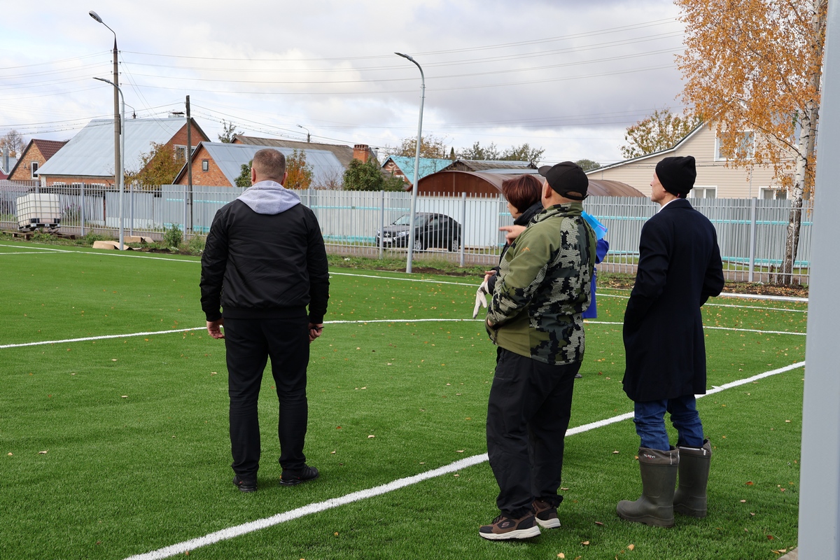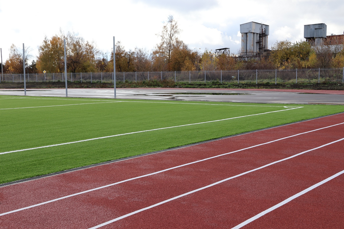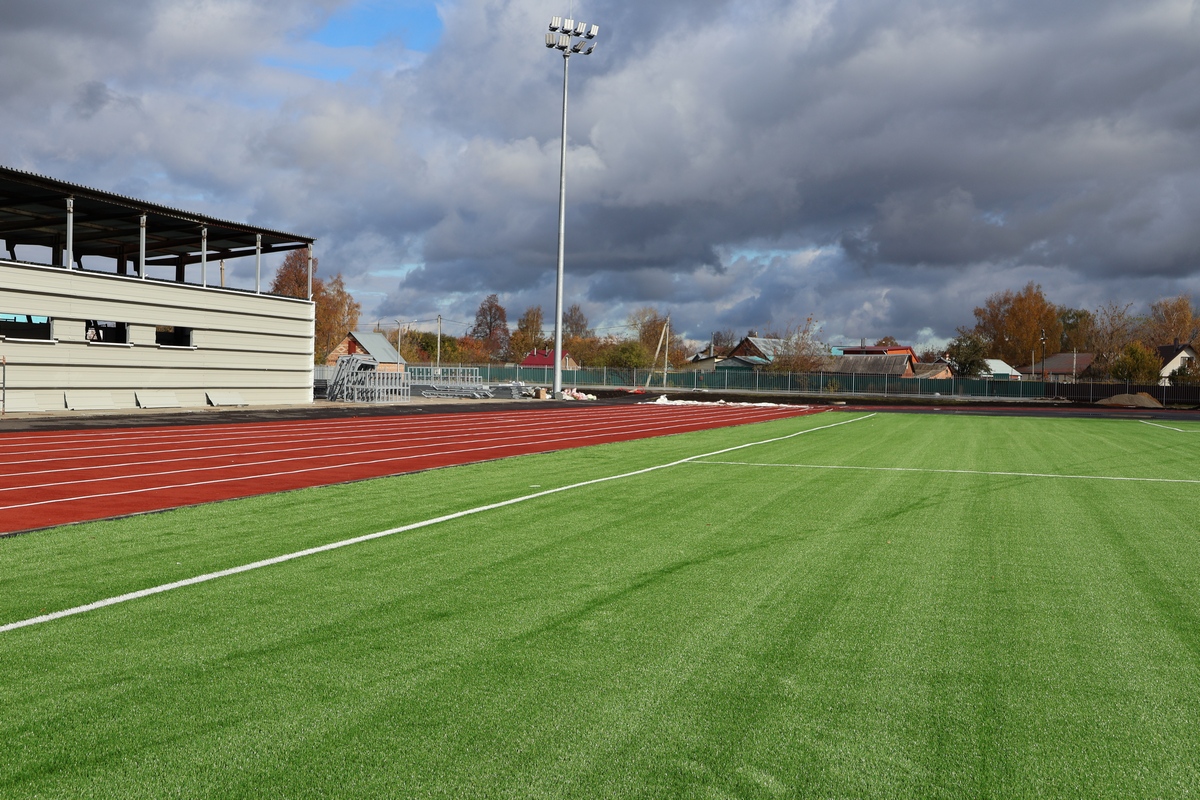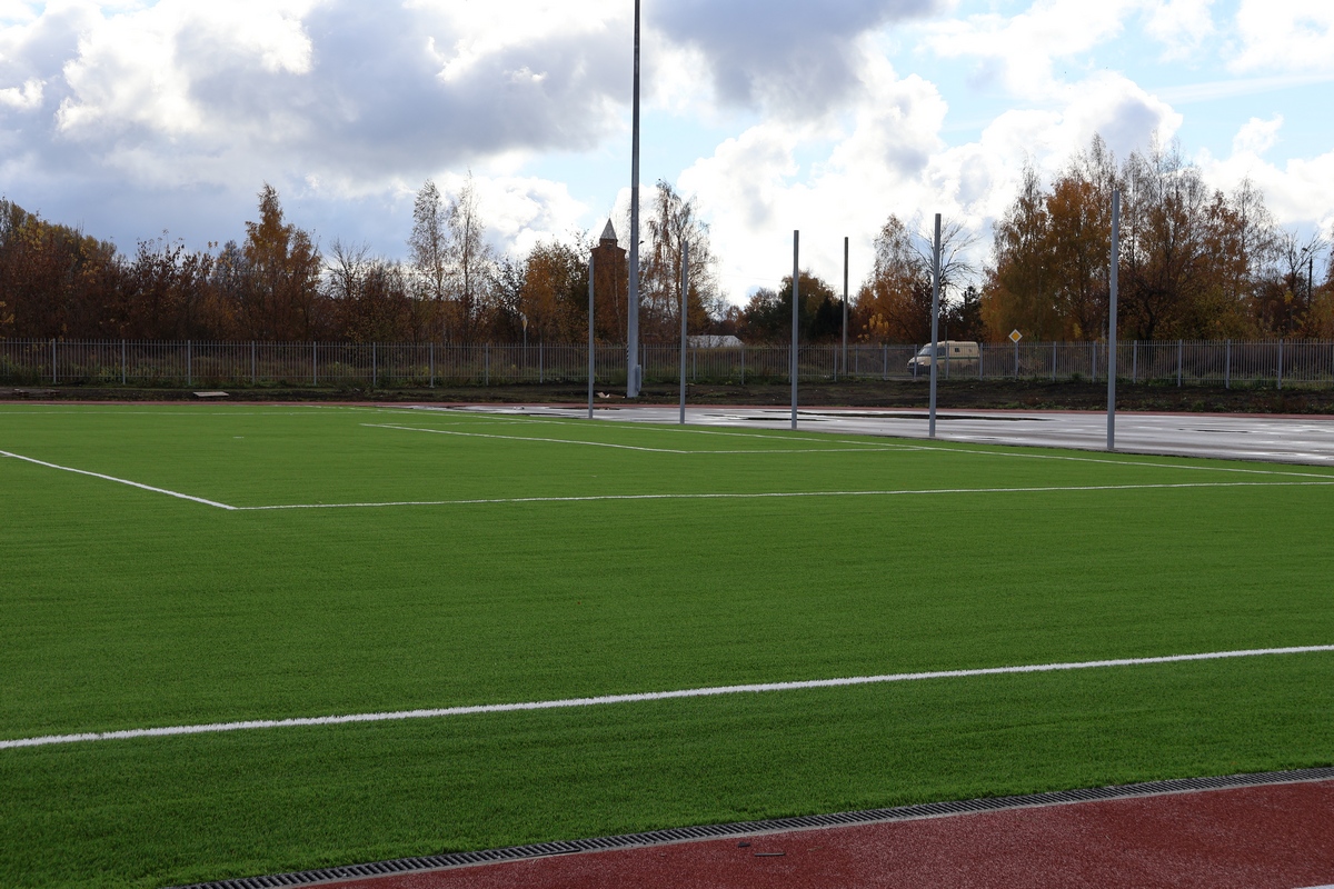 Установлено искусственное покрытие футбольного поля, освещение, смонтированы ограждения и спортивные площадки!