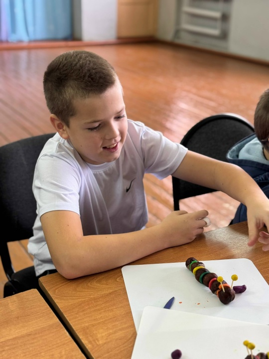 На занятии дети смастерили гусениц из каштанов. Они аккуратно соединяли каштаны с помощью пластилина в цепочку - тело гусеницы, затем украсили лицо глазками из пластилина и добавили усики.