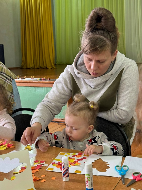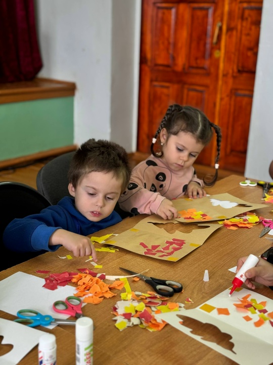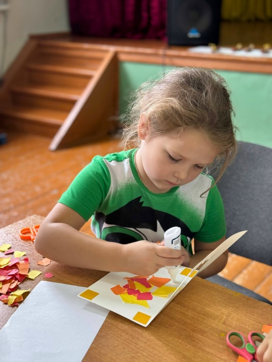 Затем принялись за аппликацию способом обрывания бумаги. В данной технике картина постепенно складывается из множества маленьких кусочков-сегментов. Всё максимально просто и доступно, но при этом интересно и занимательно.