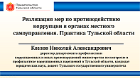 На совещании Тульскую область в режиме ВКС представлял директор департамента профилактики коррупционных и иных правонарушений министерства по контролю и профилактике коррупционных нарушений в Тульской области Козлов Николай Александрович – руководитель органа Тульской области по профилактике коррупционных и иных правонарушений, который выступил с докладом: «Реализация мер по противодействию коррупции в органах местного самоуправления. Практика Тульской области».