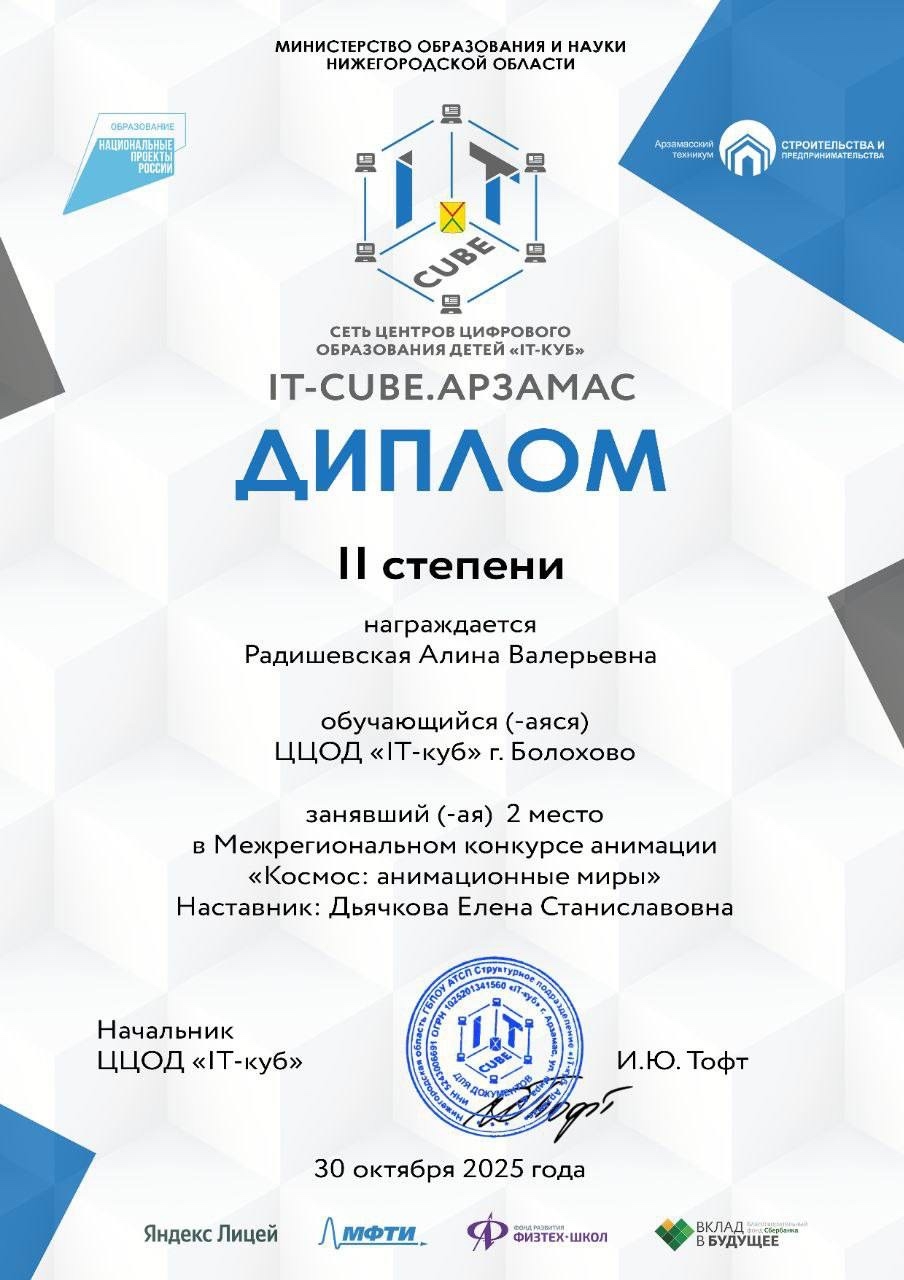 С гордостью сотрудники IT-Куб.Болохово поздравляют Алину Радишевскую с заслуженной победой в межрегиональном дистанционном конкурсе анимации, организованном IT-куб. Арзамас!