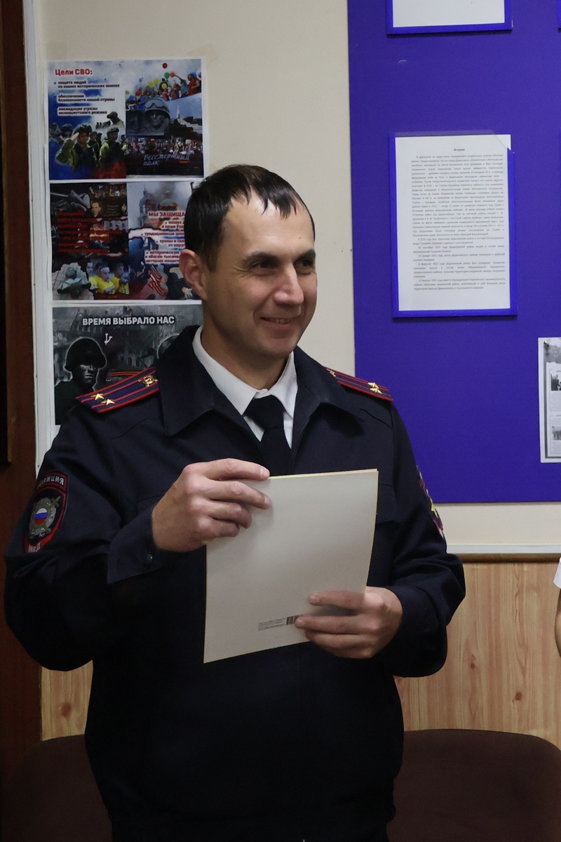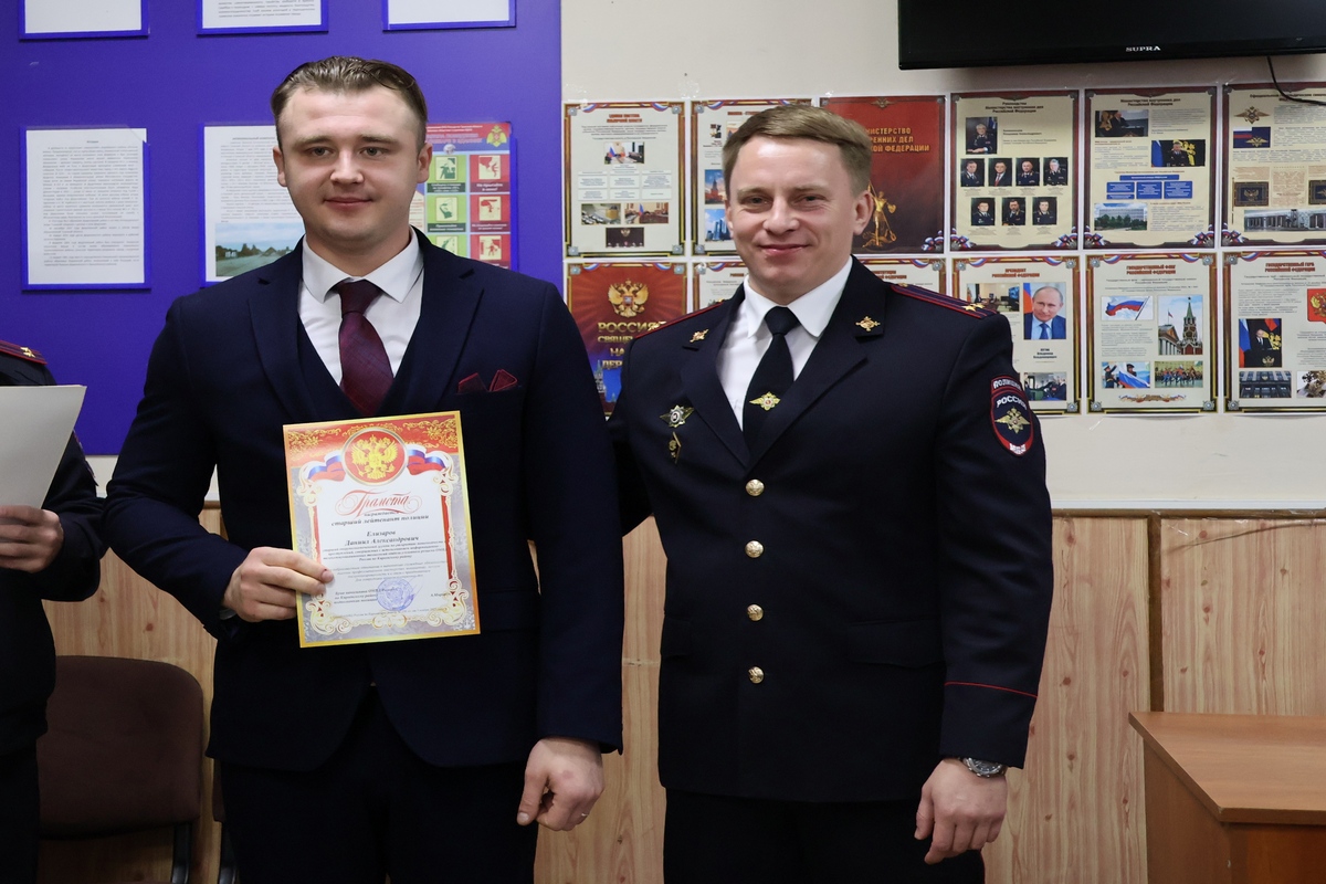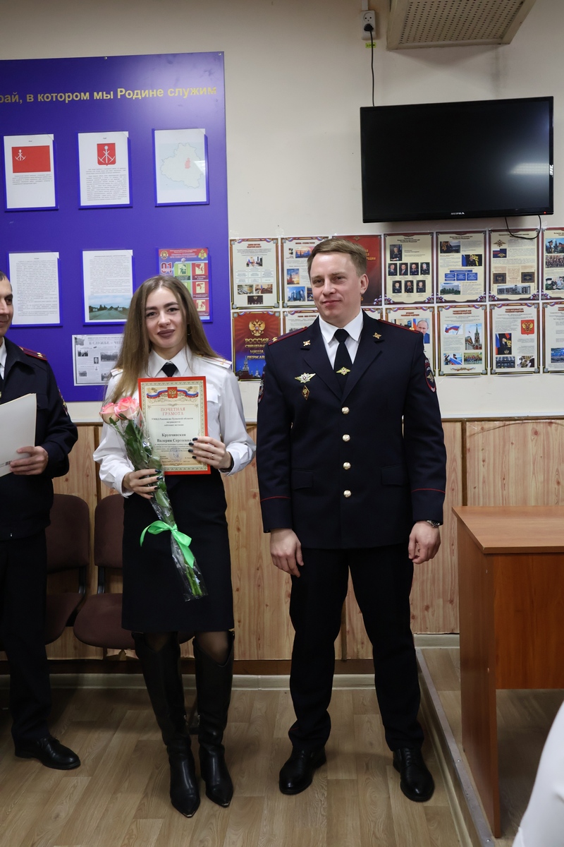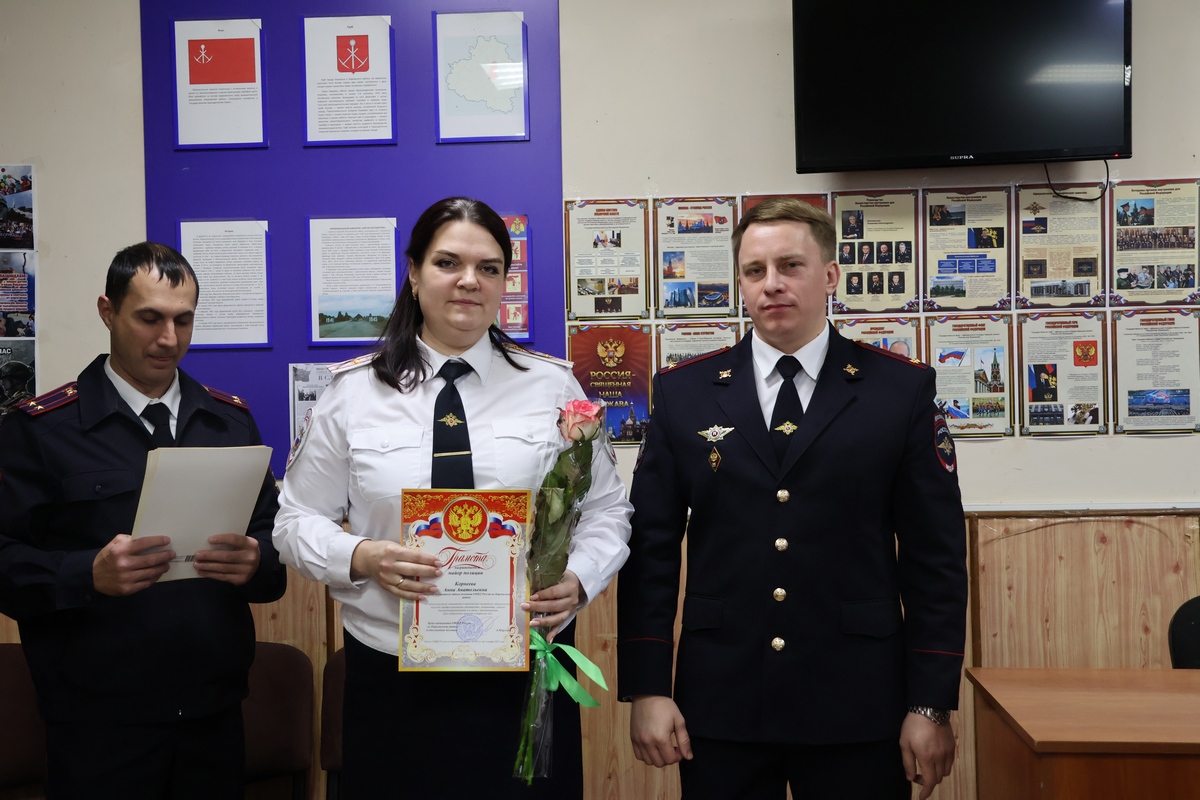 Грамотами от районного отдела полиции отметили Анну Корнееву, Елену Барулину, Сергея Афонина, Никиту Лазарева, Алёну Фасхутдинову, Даниила Елизарова, Александру Куликову, Татьяну Беспалову, Марину Селезнёву и Наталью Головкину. Каждая вручённая награда сопровождалась горделивым «Служу России!».