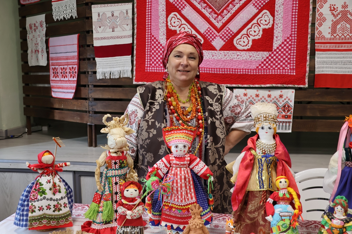 Не оторвать глаз было от выставки народной школы-студии «Традиции» Киреевского РДК. На стенде Дома культуры были представлены народные куклы, одной из которых стал прототип женщины, жительницы древнерусского города Делославля, который находился на территории сегодняшнего Киреевского района. Кукла Дедославушка была наряжена в национальную одежду наших предков - синюю в клетку шерстяную юбку-понёву, белый расписной традиционный для этих мест передник или, как сказали бы в старину, занавеска, а на голове куколки красовался обязательный элемент образа женщины – яркий платок.