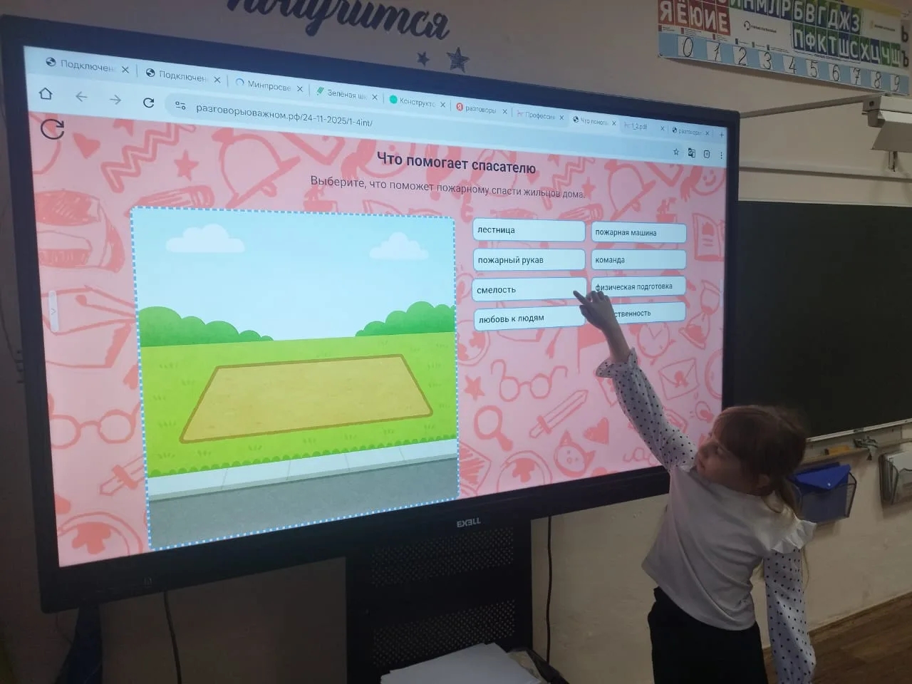 В завершение занятия ребята посмотрели видеоролик с Михаилом Князевым, мастером-пожарным Специализированной пожарно-спасательной части им. А.П. Кудряшова г. Санкт-Петербурга.
