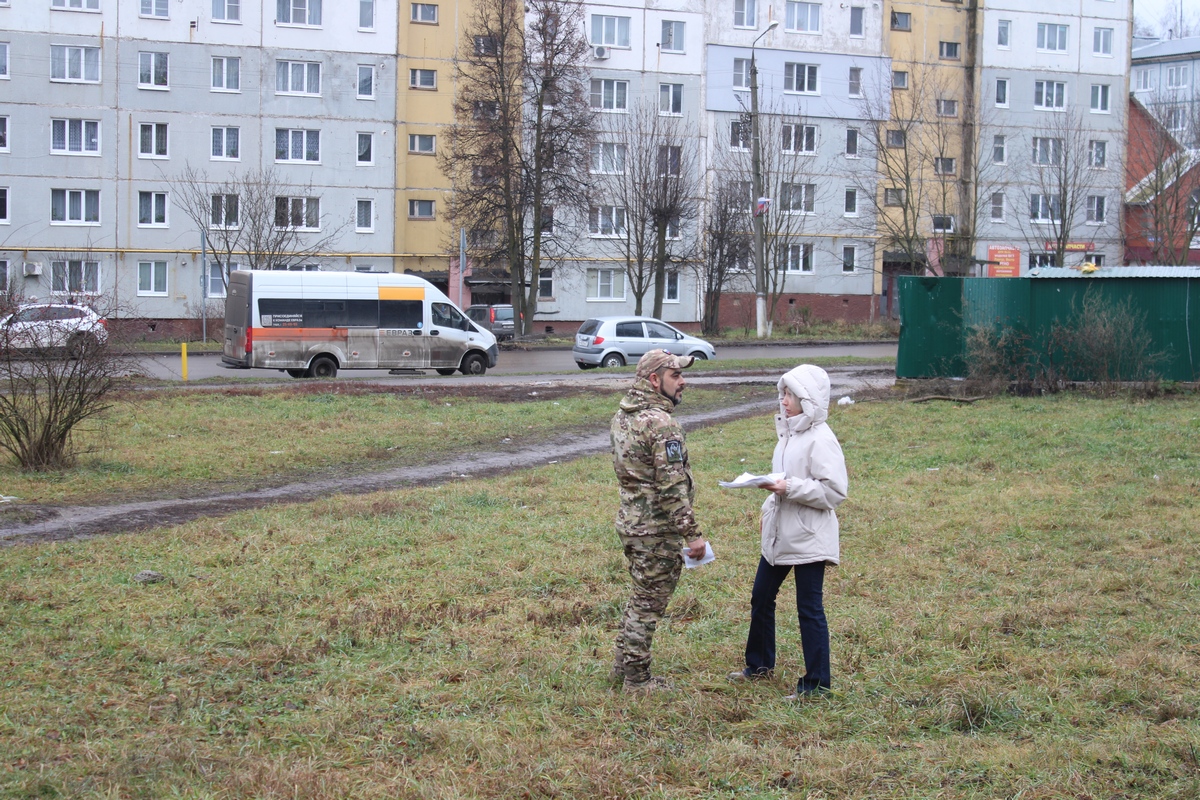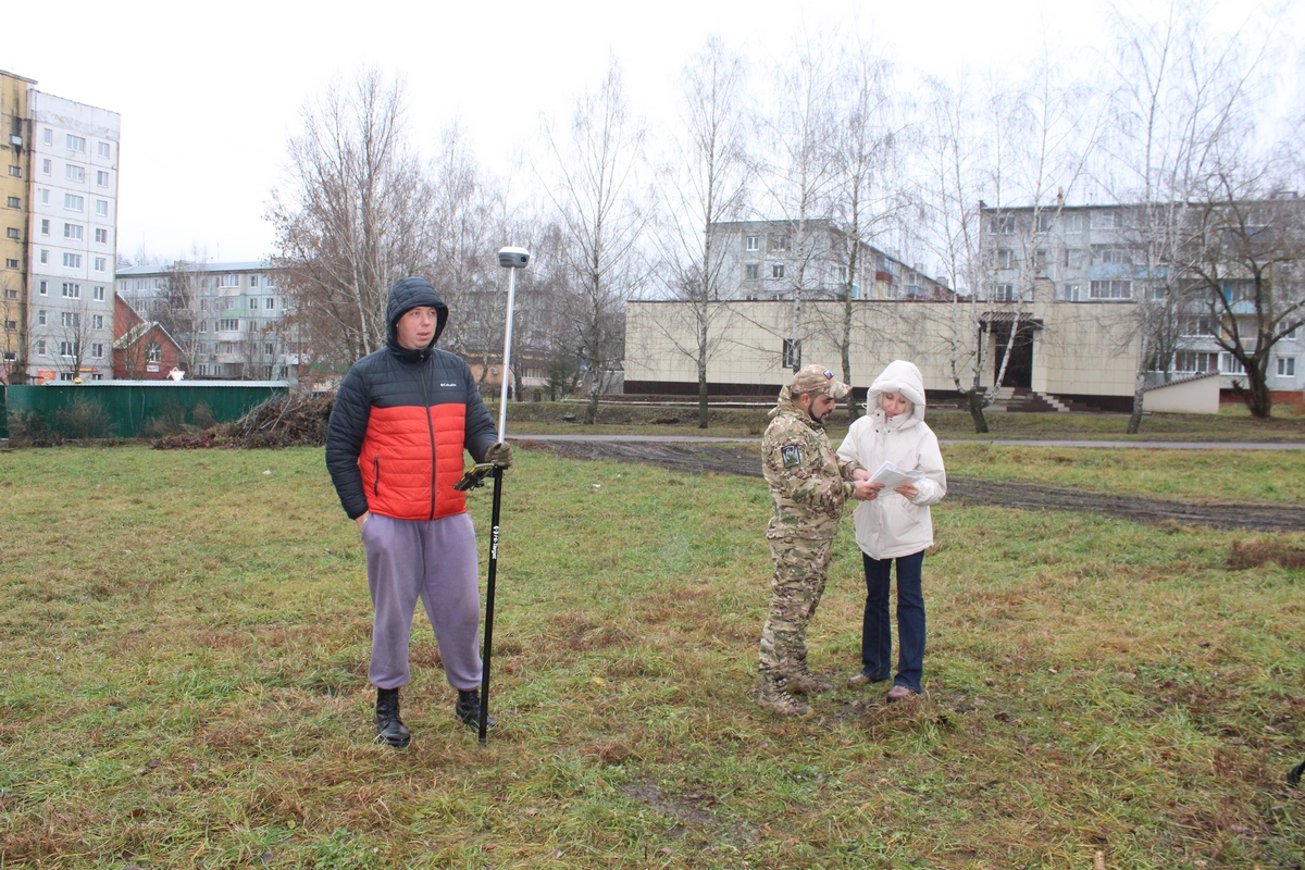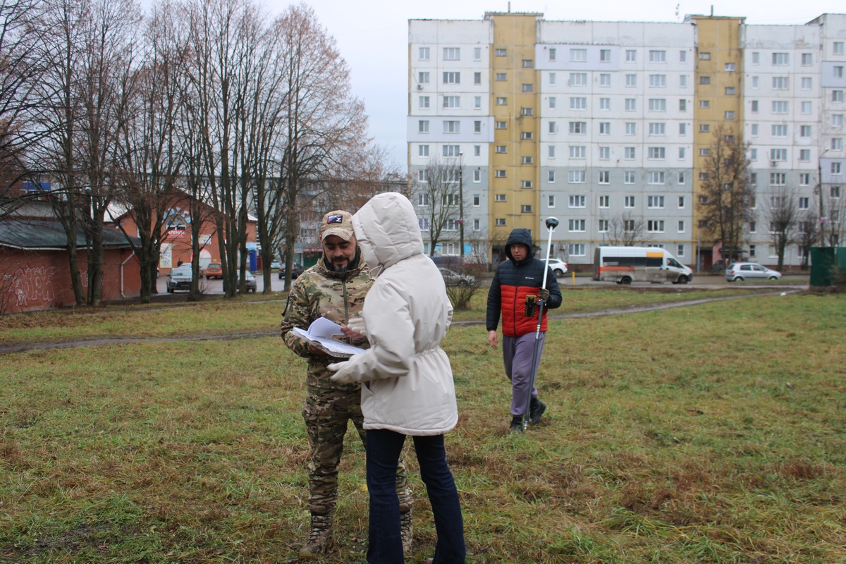 Наш корреспондент встретился с волонтёром на площадке будущего сквера, чтобы узнать подробности реализации проекта. В этот день на участке проводили кадастровые работы.