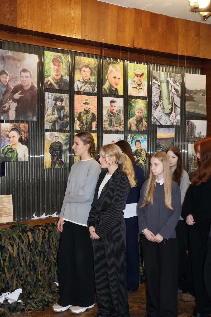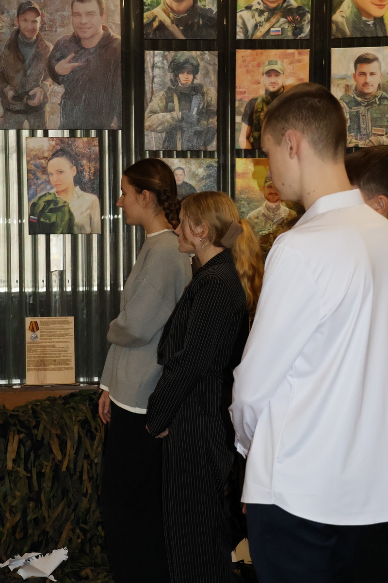 Проходя по экспозиции, некоторые ученики Шварцевского центра образования еле сдерживали слёзы. Помимо портретов героев, внимание ребят привлекли фотографии, иллюстрирующие бытность жизни новых регионов и Курской области за последние годы. Со стены на каждого из ребят смотрела разруха, свидетельство человеческого горя и потери. Важно также отметить, что под многими столбцами снимков был расположены QR-коды. Галина Кузнецова пояснила, что есть специальная программа, которая называется «Оживи». Открыв её и наведя камеру на коды, на наших глазах фотография «оживает», и мы попадаем в то время, когда это снимок был сделан.