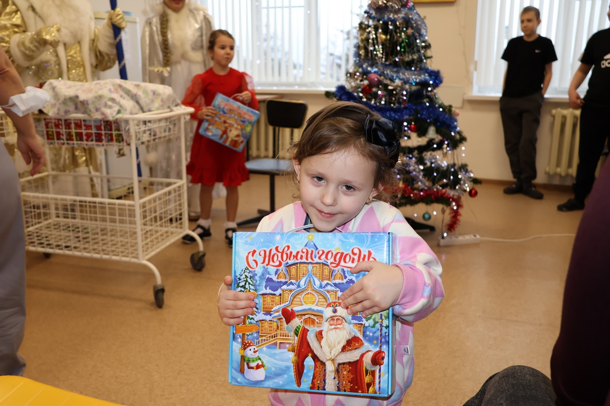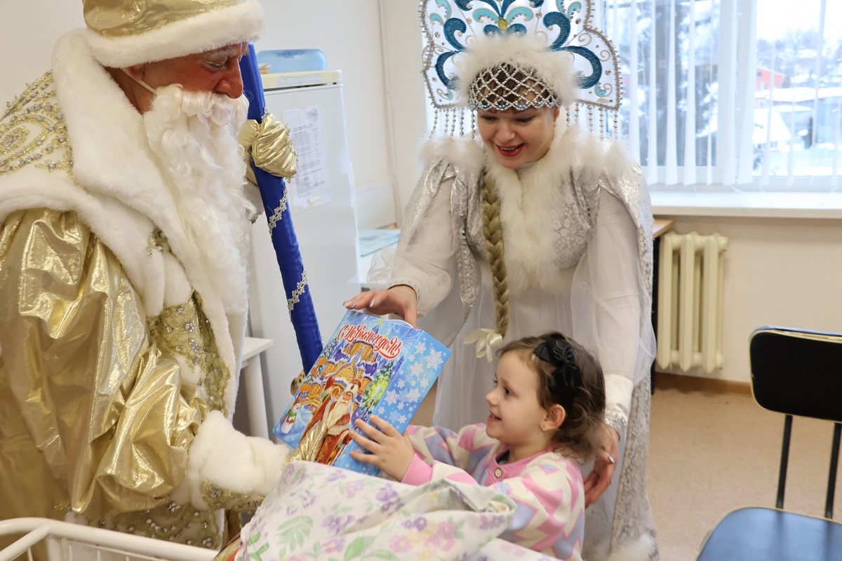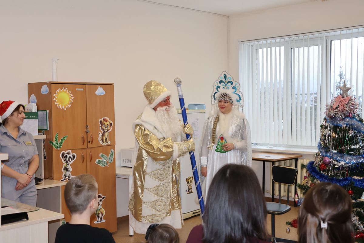 В гости к детишкам заглянули Дед Мороз и Снегурочка. Сначала к ребятам вышла внучка и устроила маленьким пациентам новогоднюю викторину, девчонки и мальчишки хлопали и топали на вопросы Снегурочки. Затем дети дружно позвали Дедушку Мороза, который пришёл к ним не один, а с подарками. Вместе ребятишки произнесли заветное: «Ёлочка, гори!», поводили хороводы и, конечно же, рассказали дедушке стихи, чтобы получить подарочек.