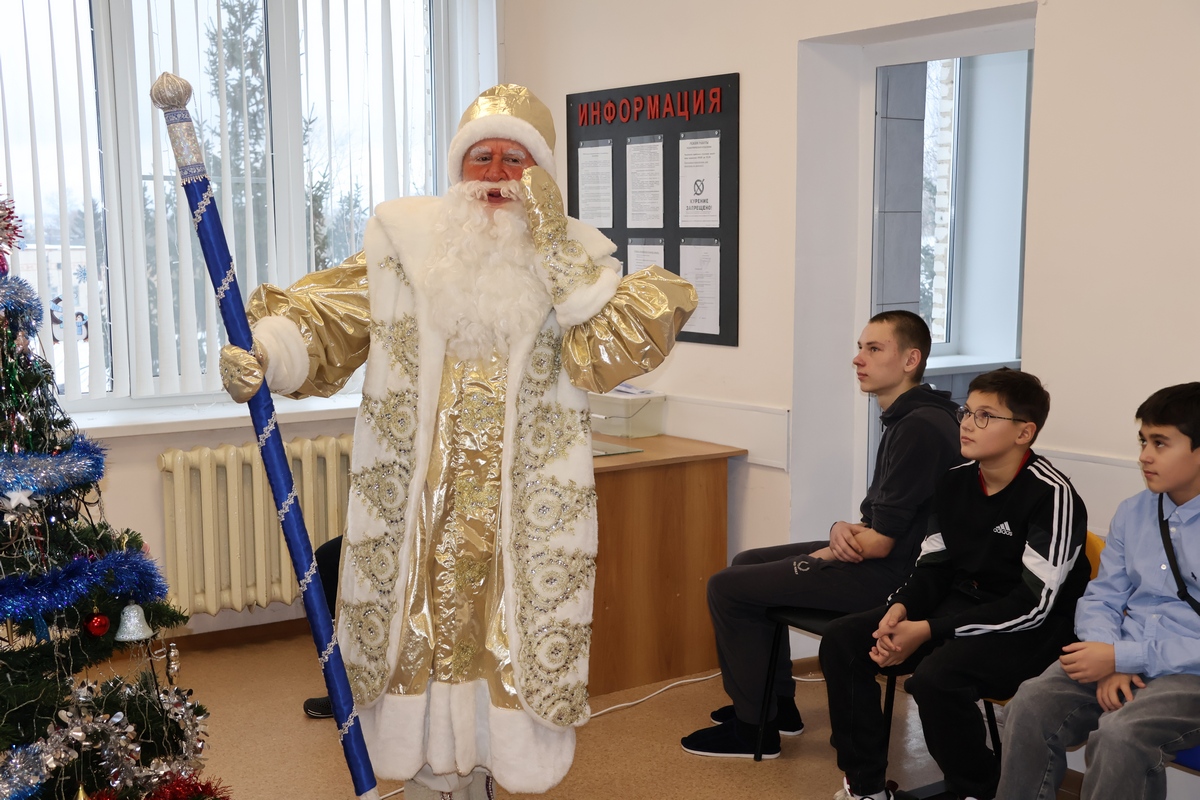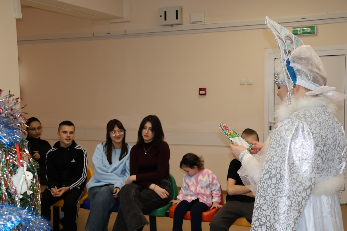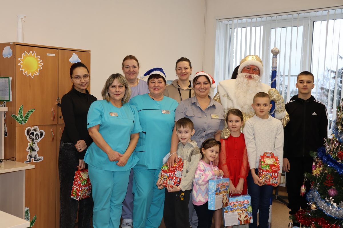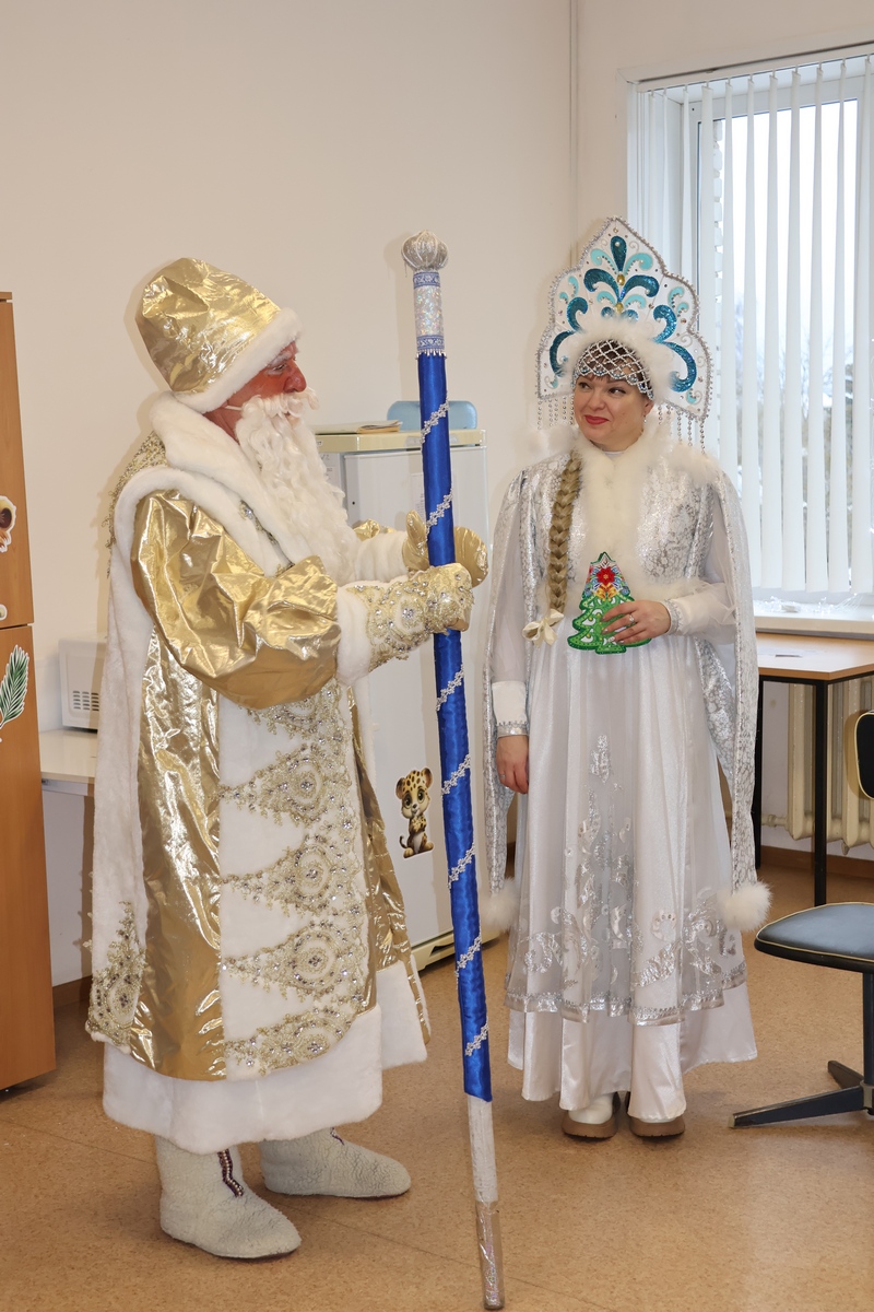 В гости к детишкам заглянули Дед Мороз и Снегурочка. Сначала к ребятам вышла внучка и устроила маленьким пациентам новогоднюю викторину, девчонки и мальчишки хлопали и топали на вопросы Снегурочки. Затем дети дружно позвали Дедушку Мороза, который пришёл к ним не один, а с подарками. Вместе ребятишки произнесли заветное: «Ёлочка, гори!», поводили хороводы и, конечно же, рассказали дедушке стихи, чтобы получить подарочек.