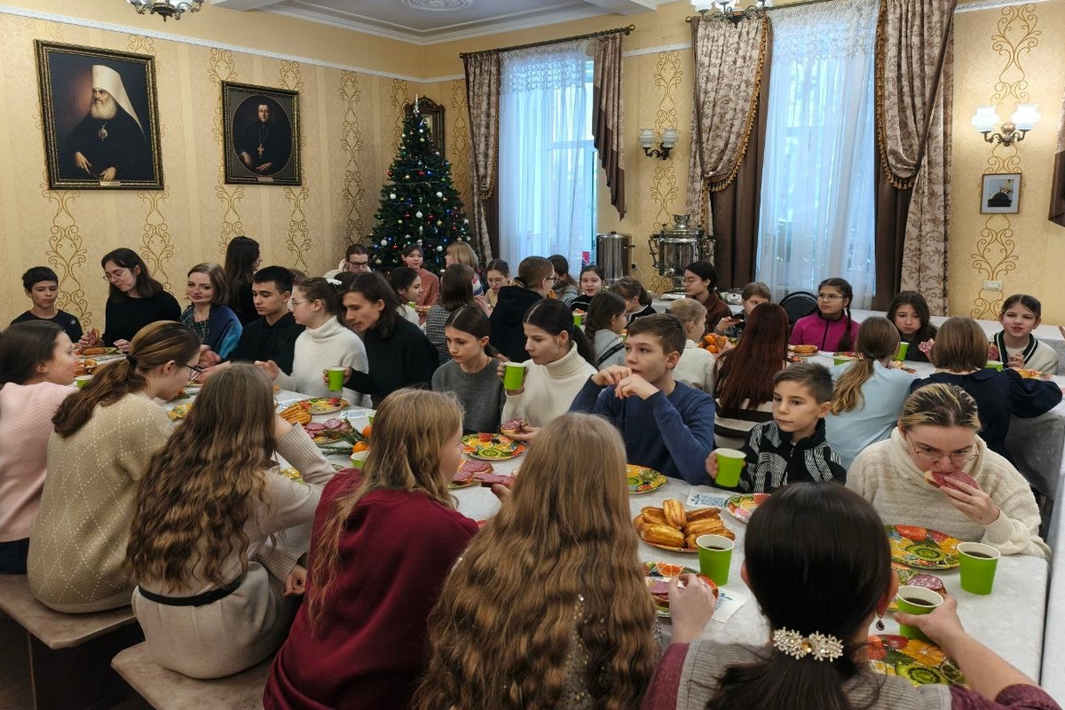 Невероятно тёплая, домашняя атмосфера царила в стенах Воскресной школы храма прп. Сергия Радонежского. Ребят и их родителей потчевали угощениями. Всем детям батюшка раздал подарки.